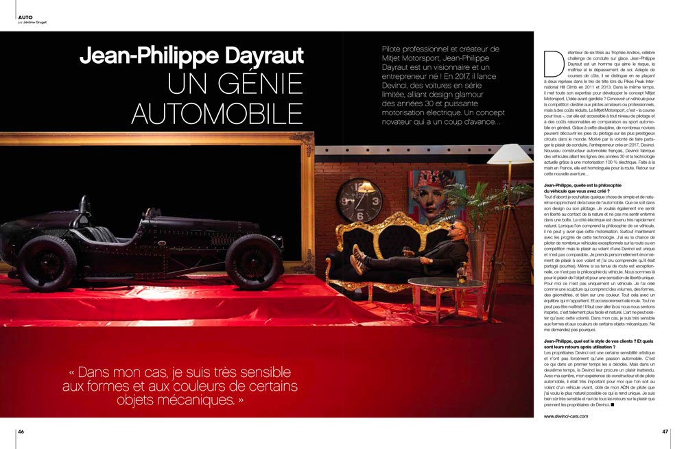 Dans le numéro 98 d’Edgar Magazine, le pilote Jean-Philippe Dayraut a parlé des ses créations, les Devinci. Ces voitures ont été présentées dans de nombreux salons, notamment le Rétromobile.